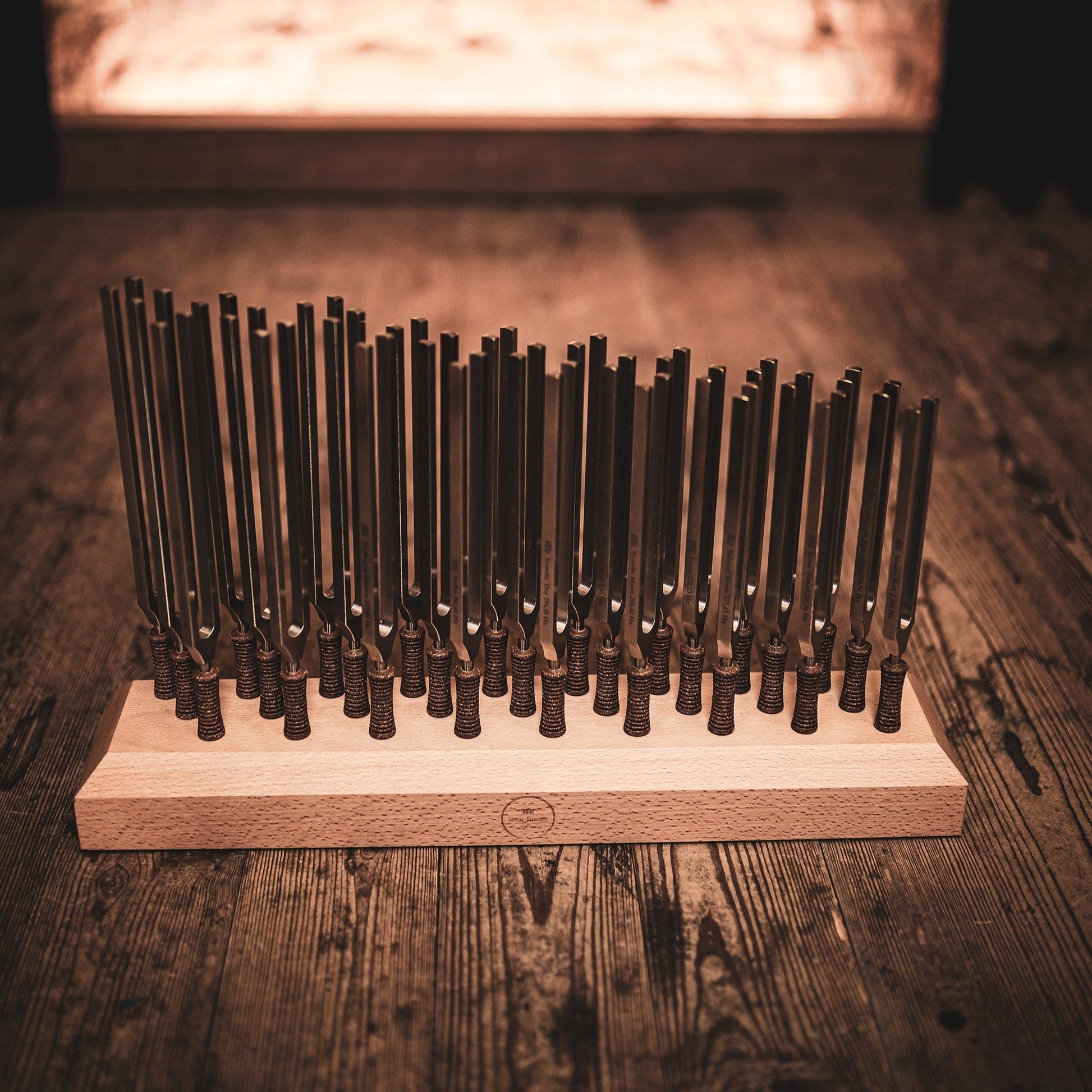The Therapy Tuning Forks are larger and heavier than the Standard Tuning Forks. This allows them to swing longer and to be struck less often during a treatment or in the professional therapy area.